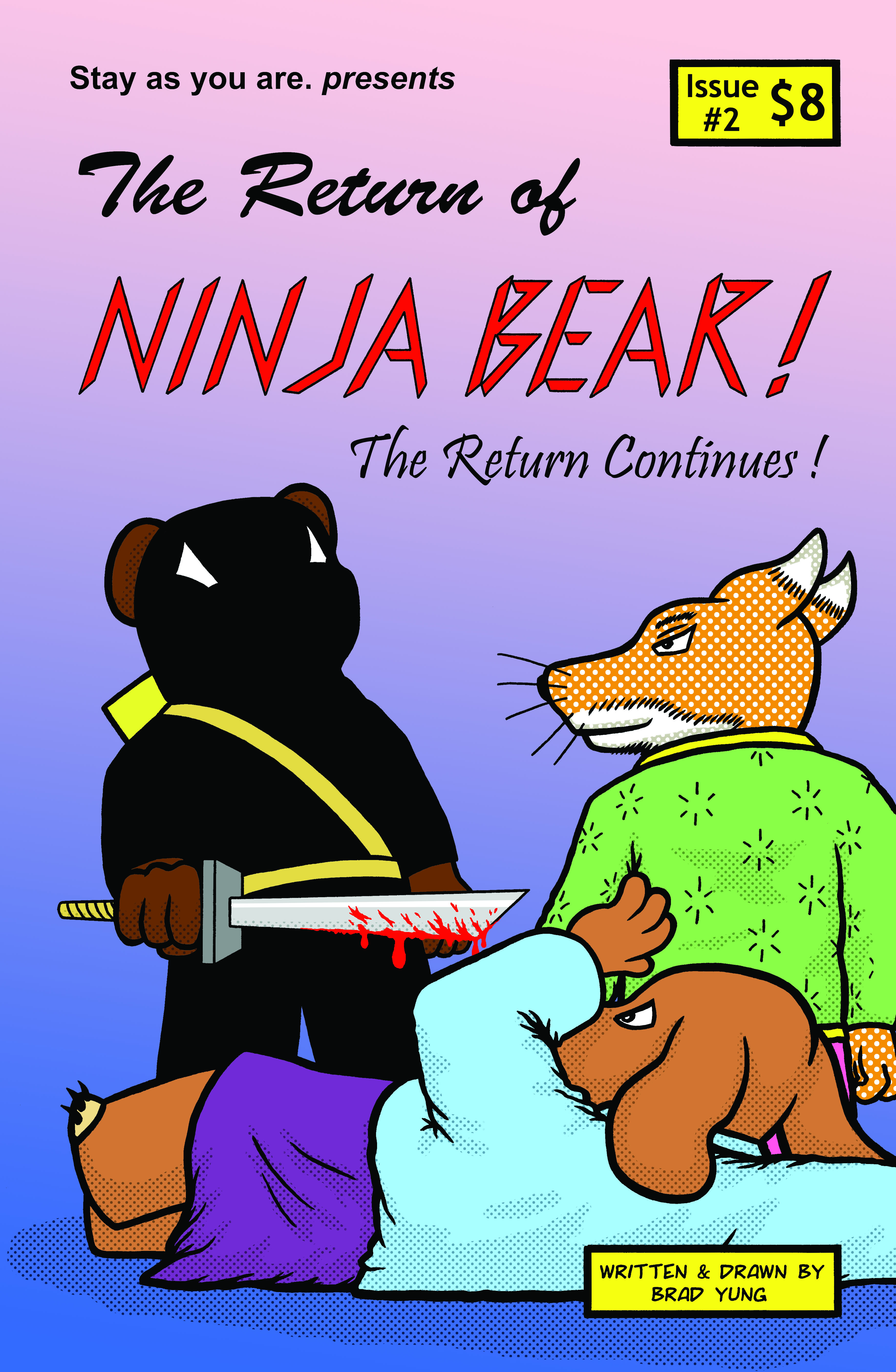 Ninja Bear #2 was finished a year later. I had an inkling that I was going to do this for a while, but I wasn't exactly sure what would happen. So, I wrapped up the Stay as you are. storyline, gave Ninja Bear a new friend, introduced a shadowy cabal of mysterious villains whose boss remains unseen, then had Ninja Bear wander around a bit encountering diversions. It's expanding the world a bit while I'm killing time, figuring out where it's all going.